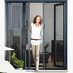 Nach innen oder außen öffnend, selbständiges, schnelles und geräuschloses Schließen. Sie sind besonders praktisch, um Durchgänge zu Balkonen und Terrassen, die oft genutzt werden, vor Insekten zu schützen.